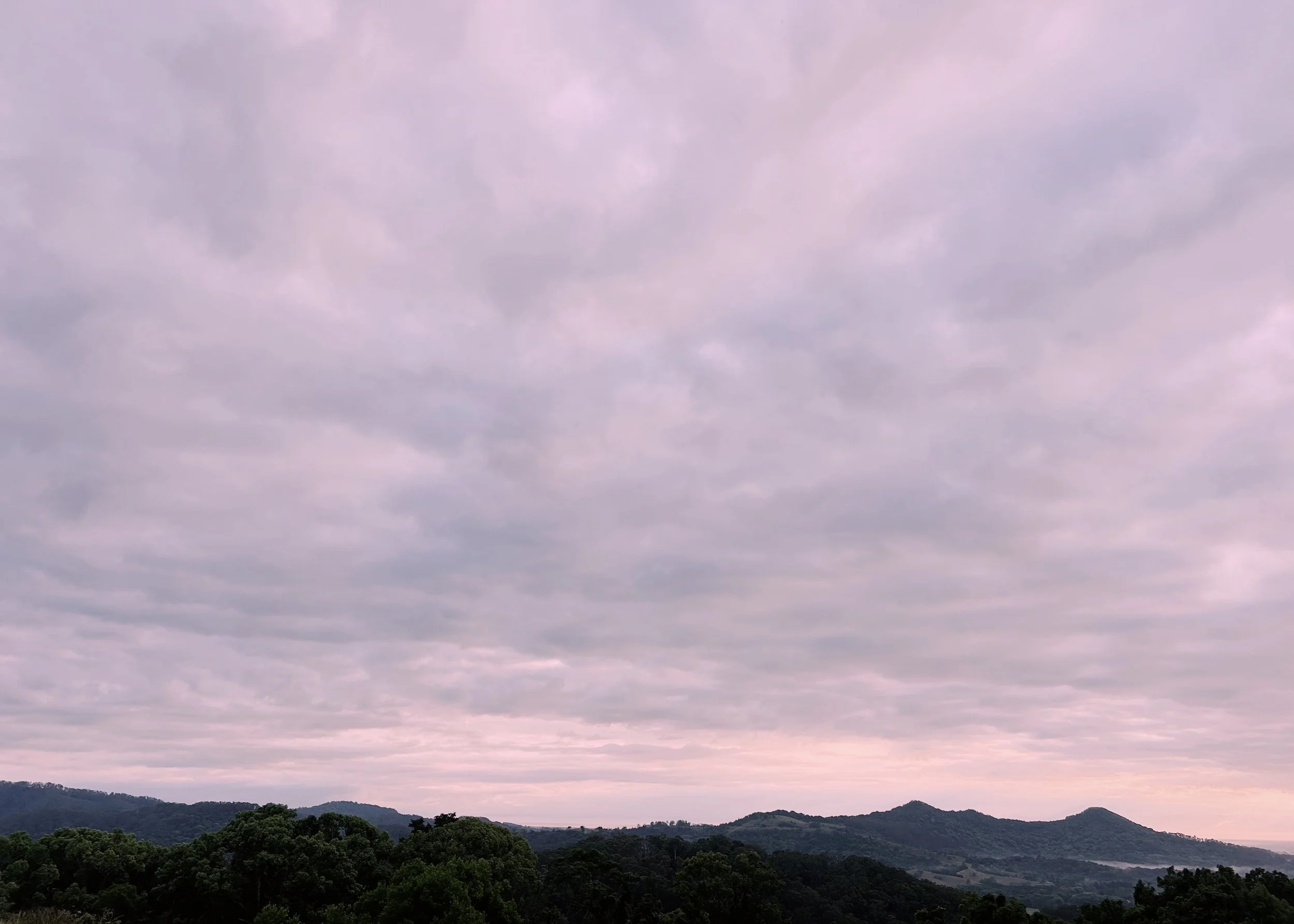 A landscape view of rolling hills under a cloudy sky with a soft pink hue at sunrise or sunset.