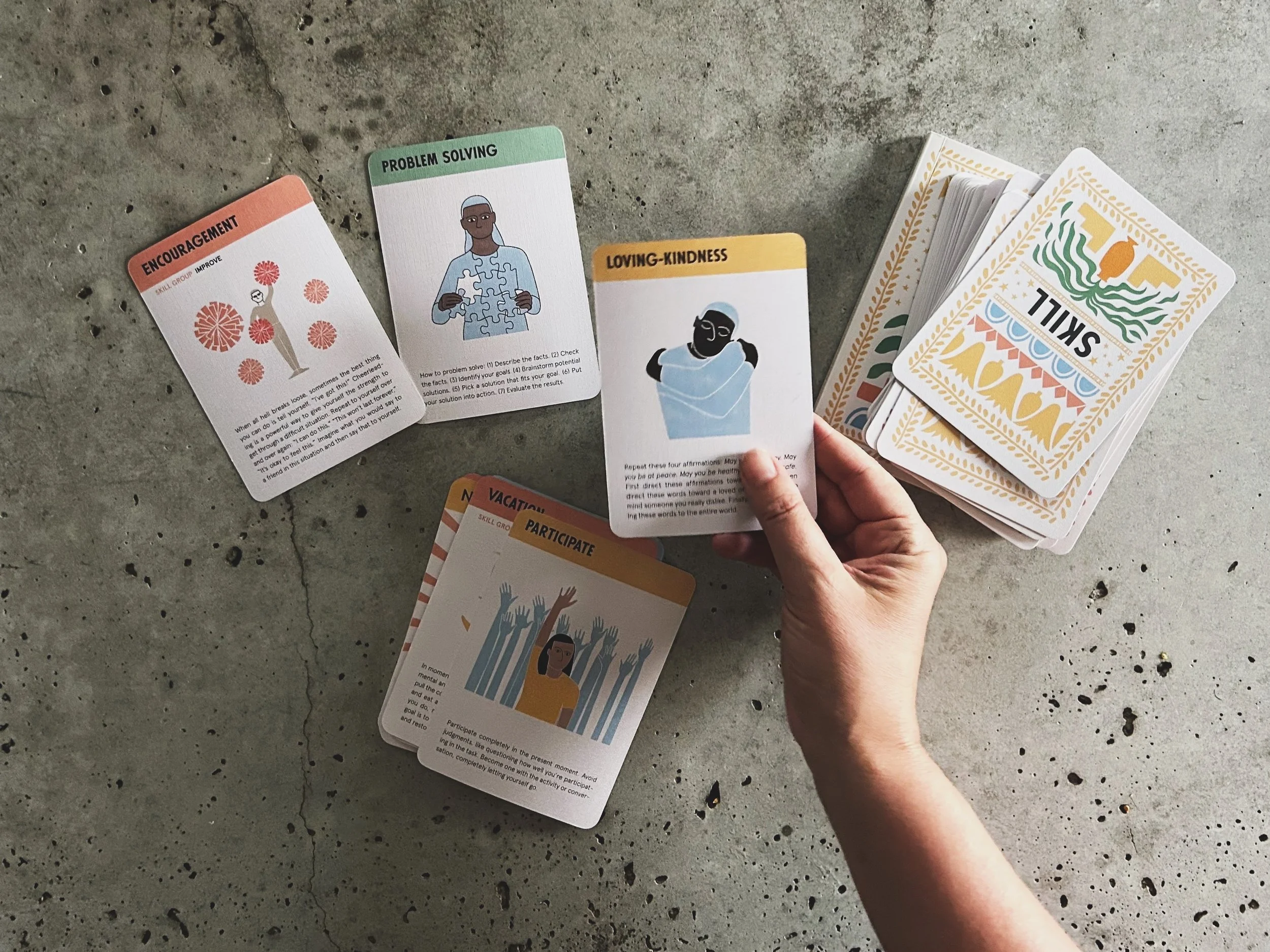 A person holding a card labeled 'Loving-Kindness' among several colorful cards with words and illustrations on a concrete surface, with a deck of cards labeled 'SVILL' nearby.